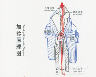 在新型渦流紡紗中,將并條后熟條直接供給牽伸裝置,經(jīng)牽伸后的纖維束從前羅拉鉗口輸出,經(jīng)噴嘴的引導(dǎo)腔和止捻腔進(jìn)入渦流室,纖維束前端在止捻腔作用下進(jìn)入空心管(空心錠子)內(nèi),纖維尾端由于離心力和氣流的作用,產(chǎn)生膨脹,形成自由狀態(tài)的纖維(可稱為尾端自由端纖維),該自由端纖維在切向噴射孔噴出氣流形成的渦流作用下旋轉(zhuǎn)而加捻成紗,由空心管引出,卷繞成筒子紗。纖維進(jìn)入噴嘴后,噴嘴室(渦流室)內(nèi)空間突然擴(kuò)大,纖維束的外層纖維受徑向作用而膨脹擴(kuò)大。纖維的前端仍存在于紗體中,被止捻腔引入空心管內(nèi);纖維尾端脫離開紗體,形成自由端,并隨旋轉(zhuǎn)氣流,在芯纖維的四周按一定方向(旋轉(zhuǎn)氣流方向)纏繞,完成紗線的加捻其加捻原理如圖所示。止捻腔的一個(gè)重要作用是引導(dǎo)纖維頭端進(jìn)入空心管中,纖維頭端進(jìn)入空決管后,尾端膨脹,并被氣流加捻成紗,形成內(nèi)部纖維平行外部纖維包覆的光潔緊捻紗線。紡成的紗線再經(jīng)清紗器,將紗線疵點(diǎn)去除后,被卷繞到筒子上。