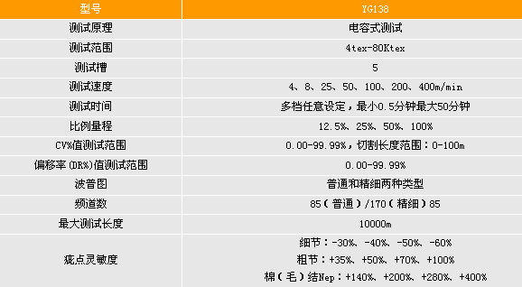 提供單管紗線波譜圖、不勻曲線圖、偏移率門限曲線、線密度頻率分布圖、變異長度曲線圖、綜合統計分析、一組統計波譜圖、一組統計變異長度曲線圖、4檔全部疵點值、AF值、2檔DR值統計、U值、5檔CVm值、CVb、Q95%、千米統計值。