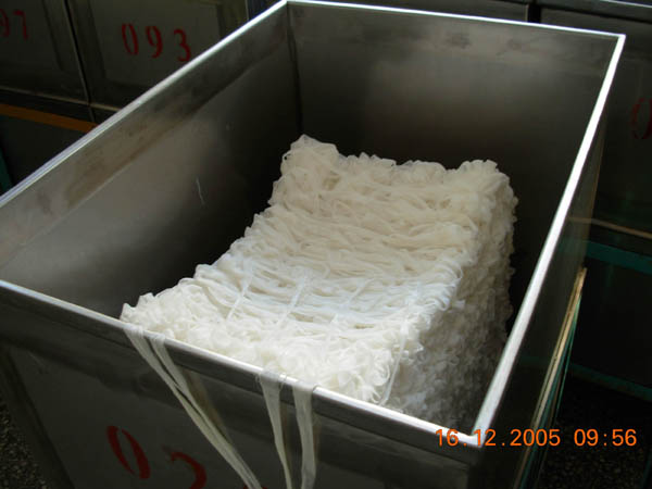 白油→計量罐→均質釜(+聚乙烯)→攪拌釜→雙螺桿擠壓機→過濾器→紡絲箱→紡絲組件→水冷卻→導絲→擺絲→盛絲桶