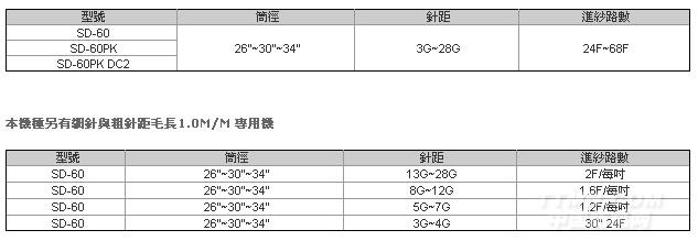 本機使用雙針腳設計的特殊織針,運行時,織針更平穩,磨損更小,織物條紋更清晰。根據定單對毛長的要求,客戶可配置多種規格的沉降片(毛高1.2~5.0 mm),提高其使用率。織物經刷毛、剪毛、磨毛、壓花等後處理工序,可製成毛巾單刷布,蜜絲絨、搖粒絨、天鵝絨、電子絲絨等多種面料,而SD-60PK C2採用的是上1段、下2段或上2段、SD-60PK DC2下2段毛巾組織設計,並備有出針、收針、半針和平針4種菱角,可編織多種PK毛巾面料,如蘇格蘭芳格布、方塊布等。 增配氨綸裝置,可編織高彈性毛巾布料。