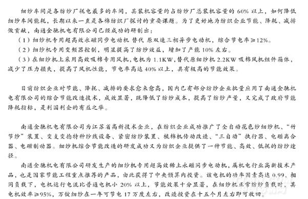 南通金馳機電有限公司為江蘇省高新技術企業,所研發的全自動多功能細紗機為紡紗廠提高效率、提高所紡線品質、增加品種的多樣性、降低生產成本、減少耗能、減少用工及工人勞動強度,又提供了一個較好的選擇。