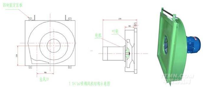②1.5KW電機,所配的葉片直徑為370mm,風量1600立方/分鐘,負壓600-900帕,配套細紗機錠數有408、420和456錠。
