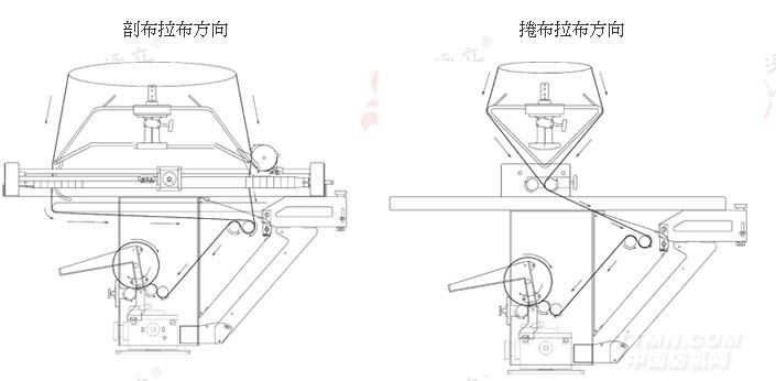 本機配備動力拉壓布膠輪,使布匹於剖開後垂直合併,於下拉時布面張力均勻,以便V形架分離布匹。
