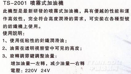 您所在的位置:紡機(jī)網(wǎng) >> 泉州百強(qiáng)機(jī)械有限公司 >> TS-2001 噴霧式加油機(jī)