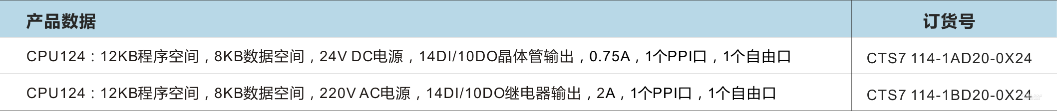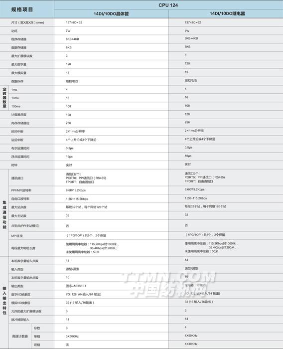 本機集成2個通訊口,其中1個PPI,1個自由通信口(FPORT),內部集成MODBUS協議,14DI/10DO共24個數字量I/O,程序空間12KB, 數據空間8KB,3路(晶體管輸出型)、4路(繼電器輸出型)50KHz高速計數器。